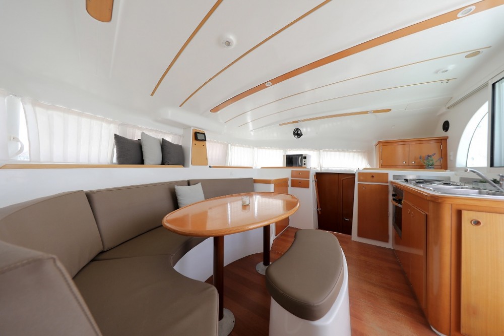 The catamaran is 12 meters in length with 56 horsepower. The 4 cabins can accommodate 12 passengers when cruising.