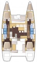 The catamaran is 14 meters long and has a power of 114 horsepower. The 4 cabins can accommodate 12 people for cruising.