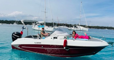 Embark on board the Beneteau 750 sundeck ruby. Located at the Palm Beach port in Cannes, facing the Lerins Islands. Ideal for family or friends outings. Pleasant, safe, it is equipped with a 300hp 4-stroke Mercury outboard engine with electric control. Equipment: teak deck, deck shower, sun awning, table, electric windlass, radio, charger, GPS plotter sounder. It includes a large sunbathing area at the front, a U-shaped seating area at the back. Beautiful cabin, refrigerator, sink, toilet, 1 large seating area for naps. You can easily navigate to the Lerins Islands, Cap d'Antibes, and the Esterel. Free parking at Palm Beach or Croisette. Capacity of k0 passengers. Sea license required, good nautical experience is required. Possibility to benefit from the services of a skipper: - €150 half day - €200 full day. No towed water sports, no fishing, no pets on board. Happy sailing