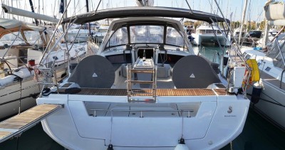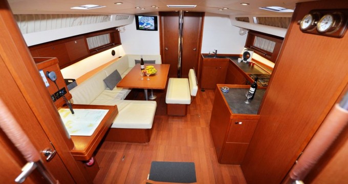 This boat is equipped with a Full batten mainsail and a Furling genoa. It has the following equipment: Auto-pilot, Outboard engine, Bow thruster, TV, Speakers, Deck shower.