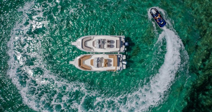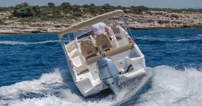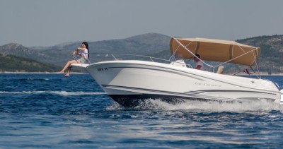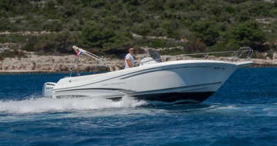 Jeanneau Cap Camarat 7.5 cc will allow you to reconcile and satisfy all your passions. It has all the advantages of an open boat: large cockpit, which does not restrict movement and large bow sun deck. The easy way to change it in a comfortable seat with a table that can gather around for a meal and a rest. It is highly adaptable boat with which you can enjoy different boating activities like coastal trips, family cruising, water sports and alternating fishing. This is ideal boat for a family day on the water cruising the beautiful middle dalmatian archipelago. The high freeboard results in high sides to the deck, which is ideal for keeping children safely where they should be in the boat. Its features a large deep cockpit, central console with a comfortable sun deck in a front and wide deck walkway to port. This french day-cruiser offers you a maximum space on water and you will enjoy unforgettable moments at sea. Cap Camarat 7.5 cc is equipped with a HONDA 250 HP, an outboard engine that will deliver you an amazing driving experience with best fuel efficiently, superior reliability and the smoothest ride ever. If you are amateur or more experienced sailors and depending on your level of skill and the possession of a valid license you can decide to sail the motorboat yourself or let one of our professional skippers take you on a holiday of your dreams. The price of the skipper is 100€ per day. Boat characteristics: • Length: 7.70 m • Width: 2.55 m • Fuel tank: 300 l • Water tank: 80 l • Passengers: 12 Equipment • Bimini sun sheet • Water shower • VHF radio • USB • Water sports equipment (on request) • GPS plotter • Boat hook • Full safety equipment on board • Anchoring and mooring equipment on board • Fire extinquisher Prices in € Daily: • (Contact information hidden) EUR • (Contact information hidden) € • (Contact information hidden) € • (Contact information hidden) € Weekly: • (Contact information hidden) EUR • (Contact information hidden) EUR • (Contact information hidden) EUR • (Contact information hidden) EUR
