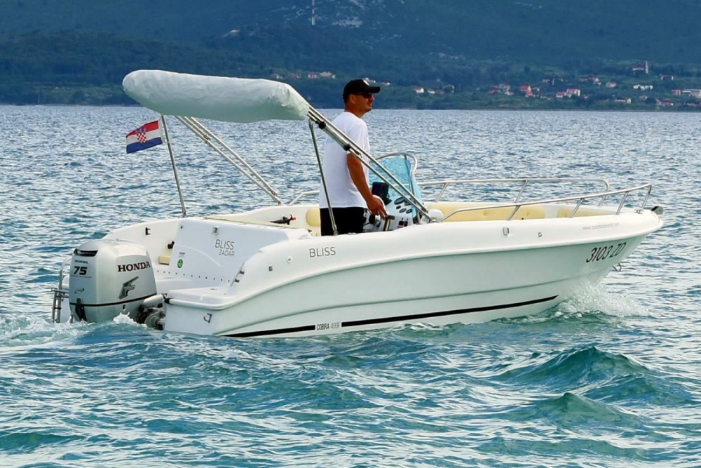 We are renting our completely renovated Cobra 499F in Zadar. It is a perfect day boat that can take you, your family and friends to the best destinations in Zadar region. With an outboard engine Honda BF75 it is very powerful and fun to drive. Whatever your intended uses are, the Cobra 499 can do it all - fishing, family cruising and sport outings. The boat is equipped with all the necessary coast guard approved safety equipment. Whatever your intended uses are, the Cobra 499F can do it all - fishing, family cruising and sport outings. ** Features : Max speed: 28 knots Cruising speed: 20 knots Fuel economy: 0.8 lit/nm Main fuel tank: 120 litres Spare fuel tank: 25 litres ** Boat Amenities : Sun shade (bimini) Cushioned sundeck Swim ladder GPS, sonar Boss Audio Marine (Bluetooth Audio Streaming) Compass with LED light 2 USB charger Navigation lights Full coverage insurance **Safety Equipment : Life jackets (6 pcs) First aid kit Torches Horn Portable fire extinguisher Emergency flashlight Toolbox ** Skipper Optional : If you need a skipper for your trip we can arrange it. Additional cost for licensed skipper is 70 EUR.